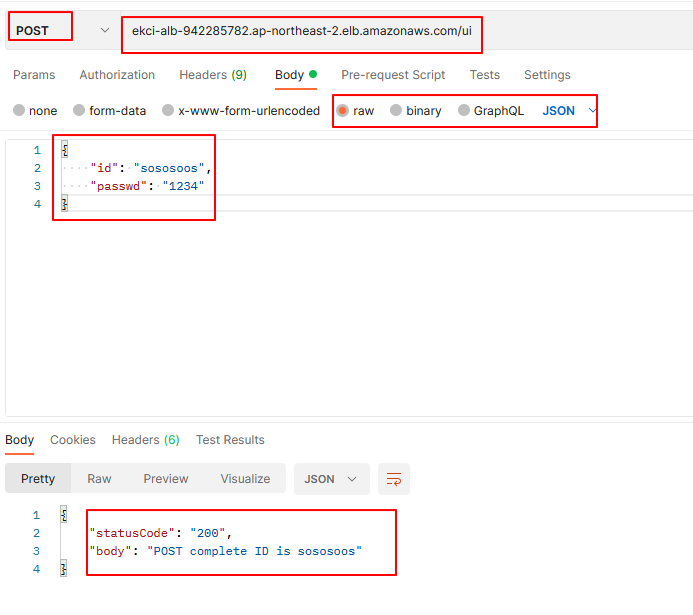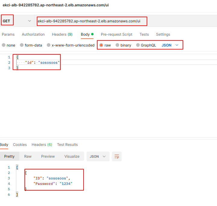 정상적으로 작동하는 모습을 볼 수 있다. 이제 Applicationi LoadBalancer로 들어가서 생성된 것을 확인을 해본뒤 생성이 완료되면 도메인을 복사해 postman으로 이동하여 아래와 같은 결과를 얻으면 성공이다.