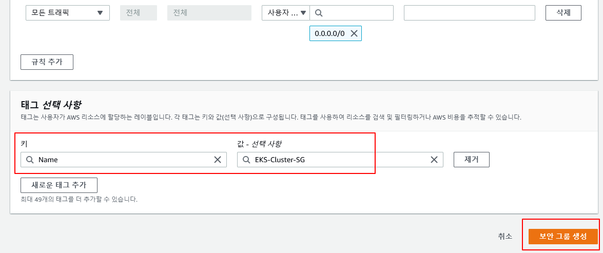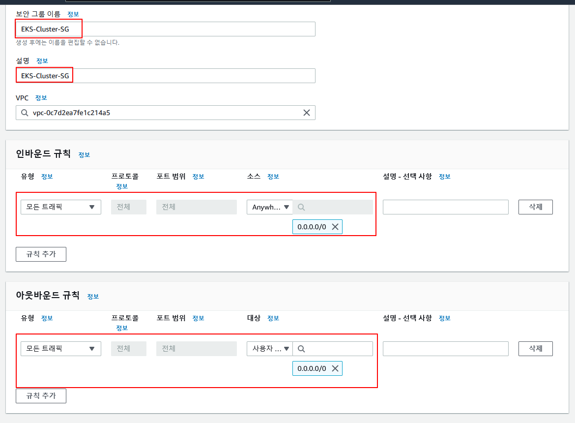 그때까지 보안그룹을 만들어주도록 하자. 해당 보안그룹은 편의를 위해 모든 포트를 열어주겠다.
